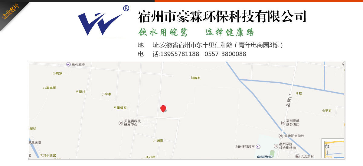 - 宿州市豪霖環(huán)保科技有限公司專業(yè)致力于水處理產(chǎn)品和系統(tǒng)水處理工程,集產(chǎn)品的開發(fā)與銷售、工程配套與安裝、技術咨詢與服務于一體的新型環(huán)保企業(yè)。主營產(chǎn)品:家用、商用純水機系列,能量活水機系列,家用、中央用凈水器系列,管線機,泵、膜系列,各種零配件、水處理耗材等配套產(chǎn)品系列,循環(huán)冷卻水處理系統(tǒng),鍋爐軟化水處理系統(tǒng),海水、苦咸水淡化、污水處理系統(tǒng),軟化及過濾裝備,紫外線及臭氧消毒設備等全部產(chǎn)品。